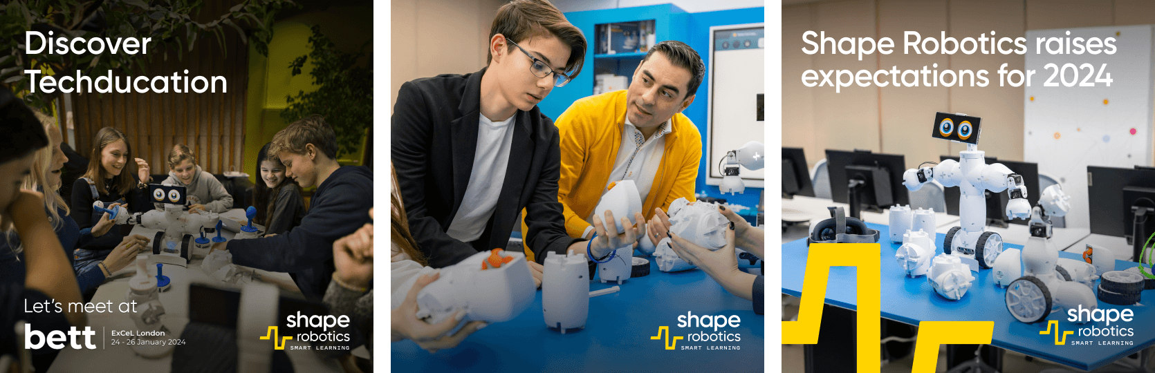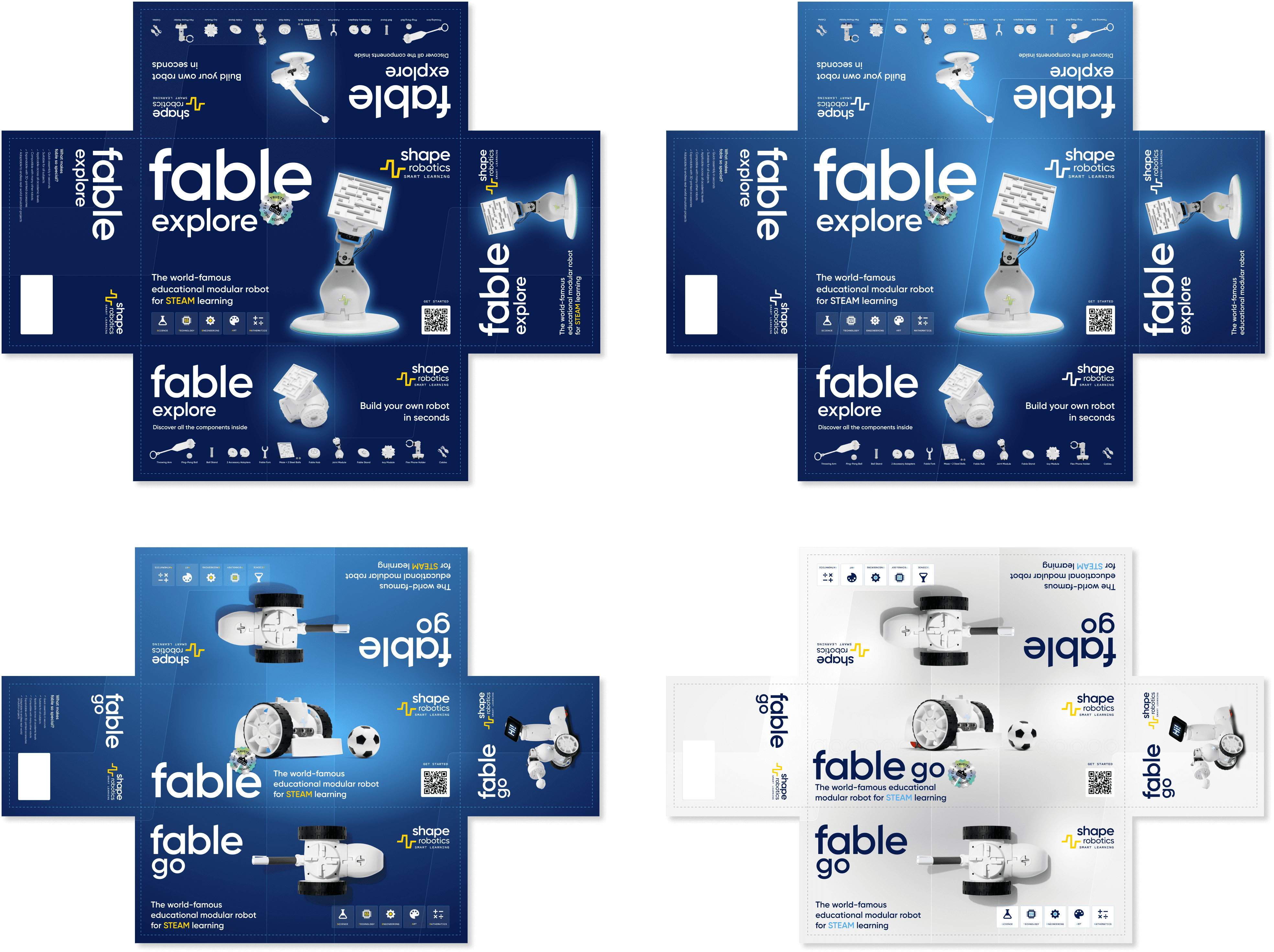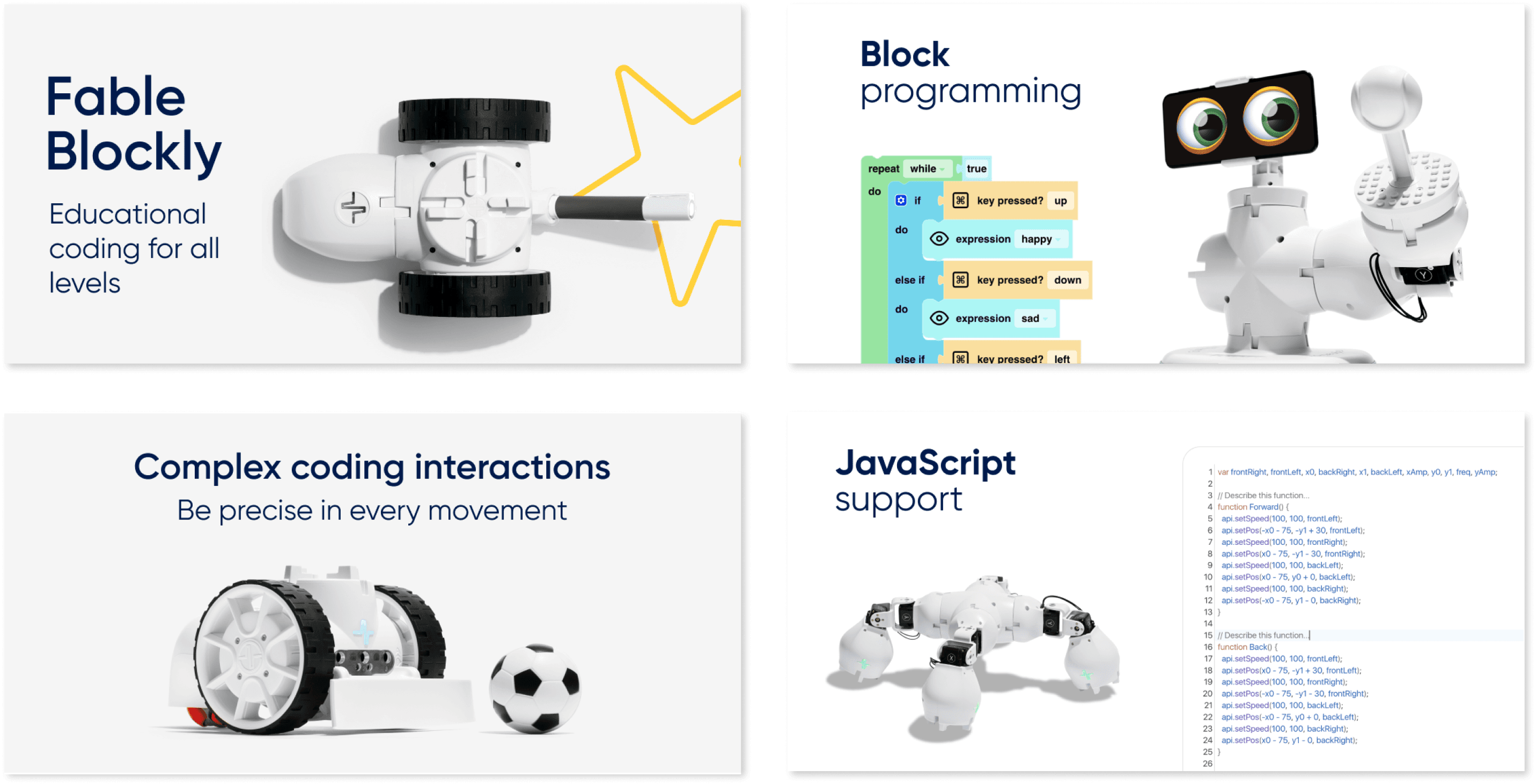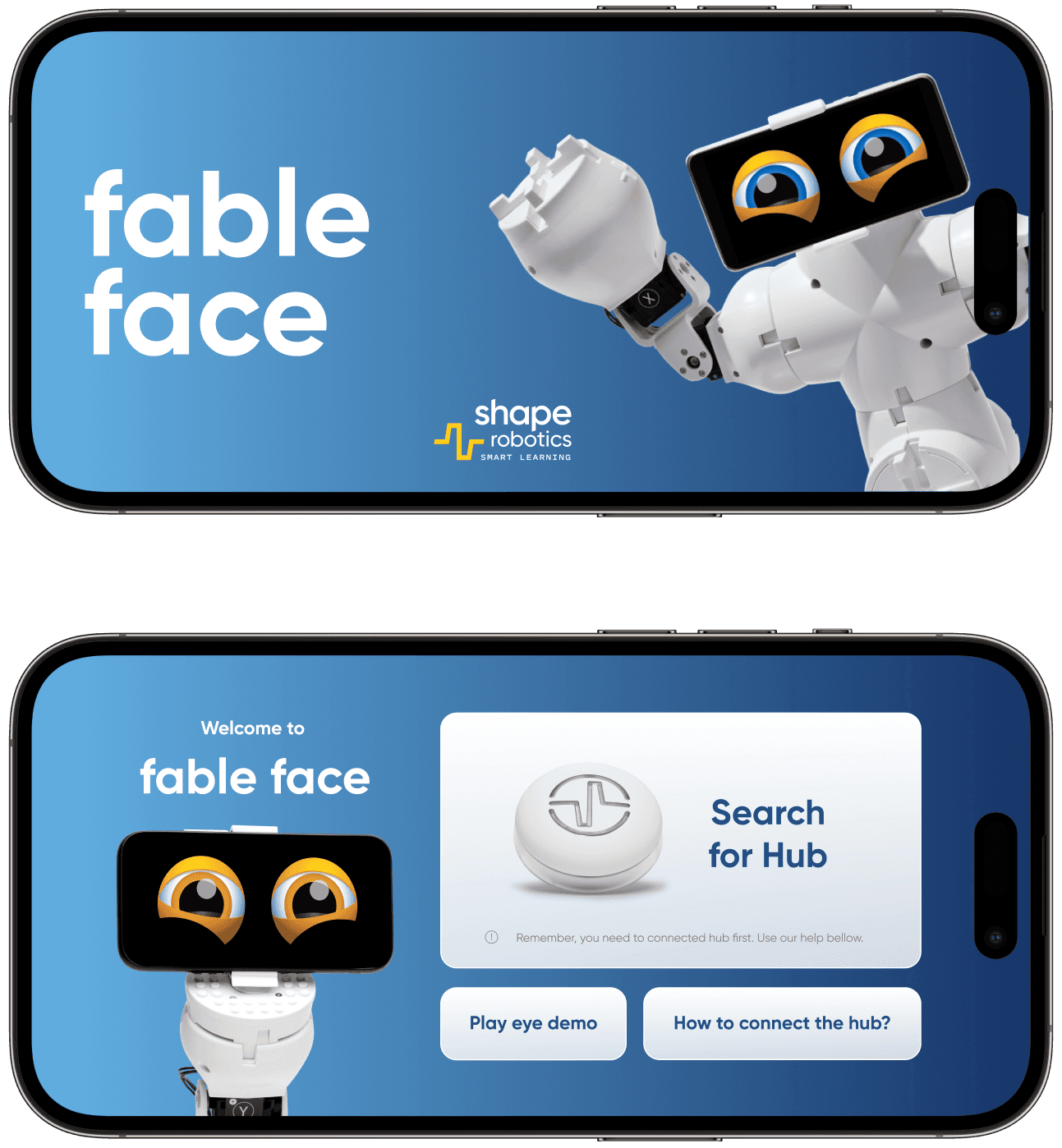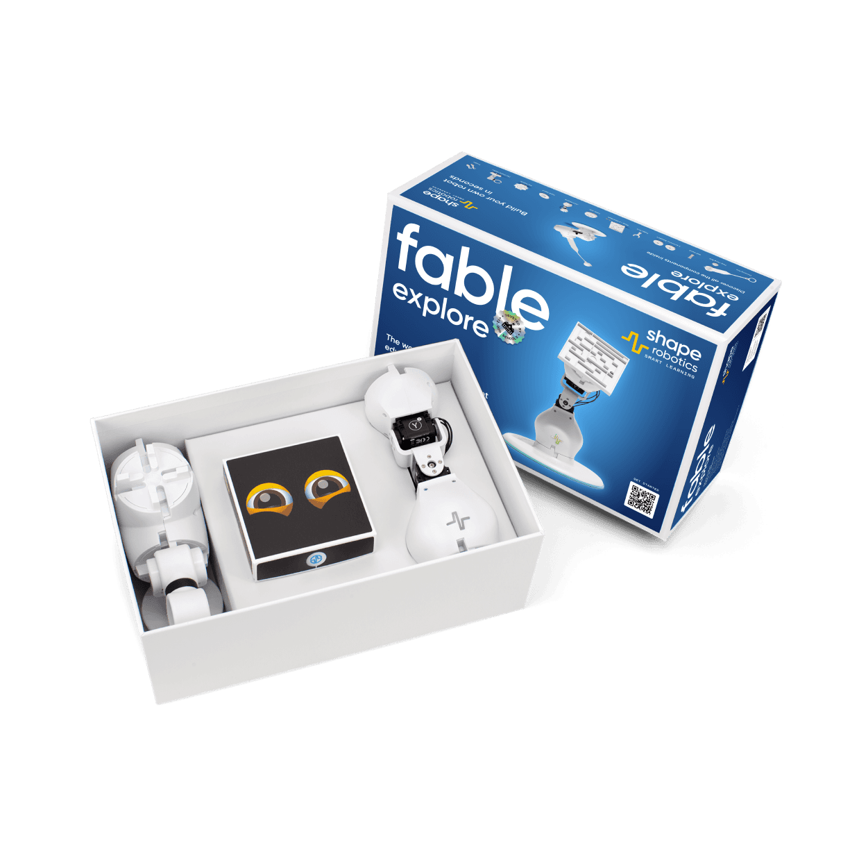 Shape Robotics is an Ed-Tech company that provides educational tools for classrooms. Their flagship product, Fable, is a modular robot that students can assemble and program to move and perform tasks. The included software, Fable Blockly, is a visual block-based platform that also supports Python. The Fable Face app brings the robot to life by using an attached phone to display expressive, customizable facial emotions that students can code for interactive experiences. Through this hands-on approach, students develop essential skills in programming, engineering, and problem-solving while coding the robot's movements in an interactive learning environment.